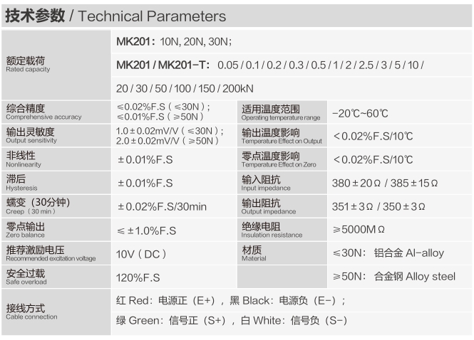 量程:10N(1kg)、20N(2kg)、30N(3kg)、50N(5kg)、100N(10kg)、200N(20kg)、300N(30kg)、500N(50kg)、1kN(100kg)、2 kN(200kg)、3 kN(300kg)、5 kN(500kg)、10 kN(1t)、20 kN(2t)、30 kN(3t)、50 kN(5t)、100 kN(10t)、150 kN(15t)、200 kN(20t);
